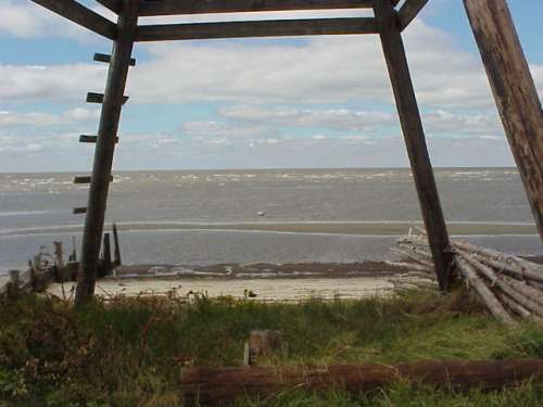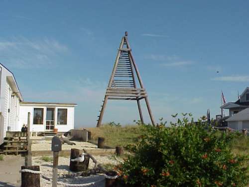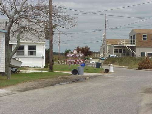Pierce's Point lies just to the south of Dias Creek. The access road from Route 47 is easily identified due to the presence of King Nummy Trail Campground at the intersection. This small community is recognized from the Bay because of the "pyramid" daymark shown in the picture at left below. In the center picture we see the Bay looking through the pyramid. All of the communities along the Bay emphasize fishing and boating. Pierce's Point has Regina's Marina as shown in the picture to the right. |